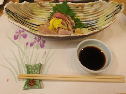 19:50 鳥刺し 向付(むこうづけ)に当たる刺身は魚じゃなくて、黒さつま鶏の刺身。 鹿児島では、鳥刺しはよく食べられる料理(?)の様です。 刺身用の鶏肉が普通に肉屋で買えるそうです。 関東の肉屋で、刺身用の鶏肉を売っているところを自分は見たことがありません。 それだけ、鹿児島では鶏の刺身が浸透しています。 鳥刺しは、ショウガ醤油、ニンニク醤油で食べるのが旨い。 |