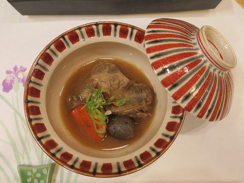 20:06 煮物は 炊き合わせ(煮物)で”豚軟骨煮”。 美味しい。 でも、本音を言えば豚の角煮が食べたかったなぁ~。(笑) |