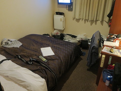 7:59 荷物を片付ける 部屋に戻ると、荷物が散乱。(笑) 少しは乾いたかな。 それでは、片付けて、荷造りして、出発しましょう。 |