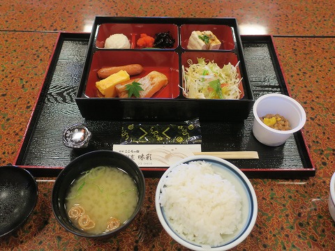 7:41 朝食です。 朝食は7時半からで。 ちょっと遅れて、お食事処へ。 朝食は、夕食と同じ1階で。 ご飯とみそ汁で定番の和食。 関東人としては、納豆があるのが嬉しい。 |