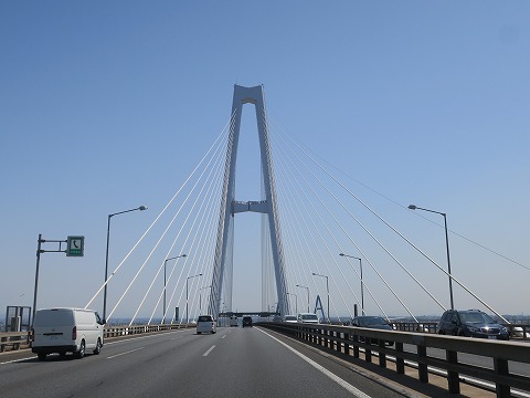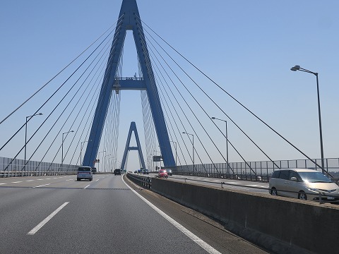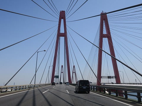 10:47 名港トリトン(赤) 東名阪自動車道を北東に進み、四日市JCTから伊勢湾岸自動車道へ。 名港に架かる3つの橋、名港トリトンを通過します。 まずは飛島インターを通過すると見えてくる赤色の橋は、名港西大橋。 |