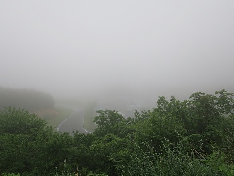 8:01 ガスって 8時ちょっと前にゲートオープン。 いつも写真を撮っている、眼下にサーキットが見える場所に・・・・。 ガスって見えん。(>_<) (左下にちょこっとだけコースが見えています。) |