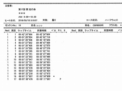 9:59~10:22 ラップタイム~ 走り初めから16周してピットイン。 探り探りペースを上げていって、今回のベストは、ピットイン前の周で、 1分21秒9。 ダメダメじゃん。(爆) 普通、ドライコンディションの3秒~5秒落ちって言うんだから、自分だったら 1分10秒を切ってこなくちゃダメなわけで・・・・。 21秒じゃ、話にならないね。 視界は大事です。(笑)� |