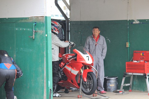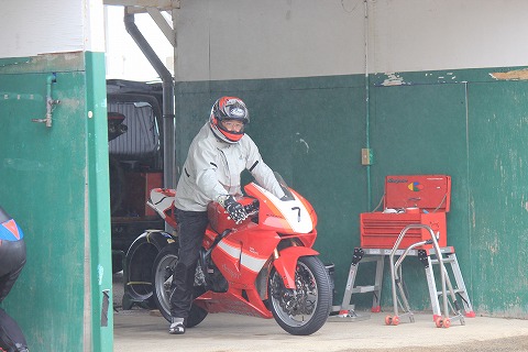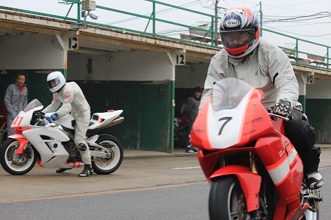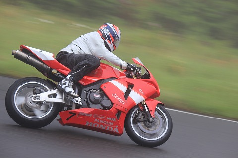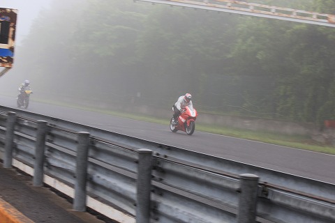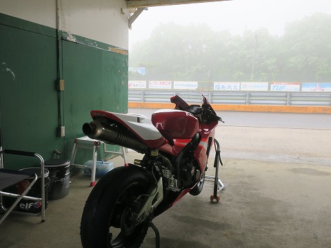 10:00 ピットから出ると、後ろでCBR1000RRの中川さんもピットアウト。 ピットの路面は濡れていると言う程じゃなくてシットリです。 |