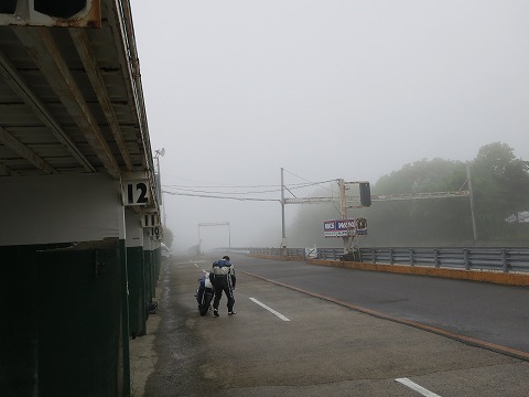 10:34 ますます ますます、ガスが濃くなってきています。 霧とかガスとかじゃ無くて、標高が高いのでこれは”雲”だね。 ホームストレートを駆け上がってくるバイクが、霧の中から現れるので、それはそれでカッコいいんですけどね。 (走っている方は、たまったもんじゃありません。) |