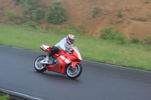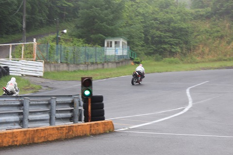 10:05 S字の入り口は 1コーナを曲がった直後のS字の入り口は、路面はウェット。 かといって、水しぶきが上がるほどじゃないんですけど。 S字に向かって下っているので、無理するとフロントタイヤから滑って行っちゃいそうで、怖い。 |