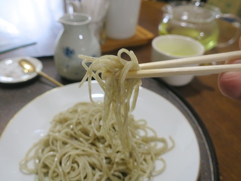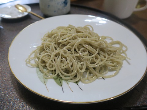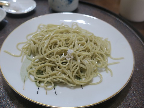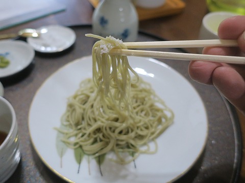14:15 生粉打ち 続いて供されたのが、十割の生粉打ちそば。 「塩で味わってみて下さい」と言われましたので、まずはそばの上に塩をちょっと載せて。 しかし、打つのが難しいと言われる十割蕎麦を細く打ちますね。 |
