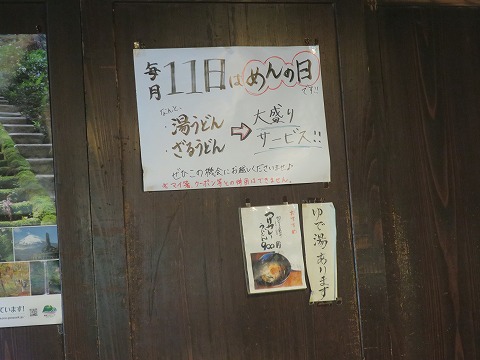 15:27 毎月11日は おでんを摘まみつつ、店内を眺めて、うどんの茹で上がりを待ちます。 ”毎月11日は、大盛りがサービス”なんですね。 忘れないように写真に撮って、記事に書いておきましょう。(笑) と言っても、大盛りは通常100円増しですけどね。 |