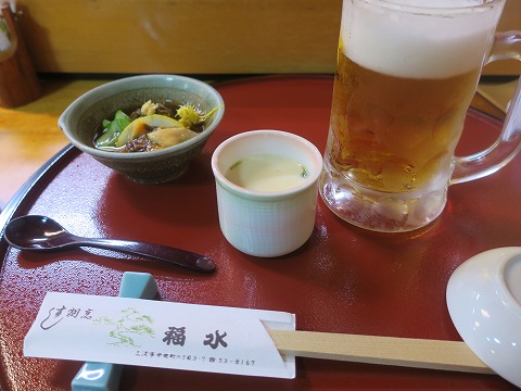 19:48 ここの定番 まずはビール、何と言っても生ビール。 そして、つき出しは定番の茶碗蒸しと、ホヤ酢。 それでは早速、「いただきます。」 |
