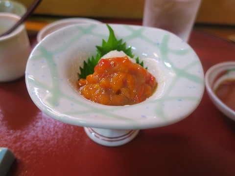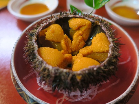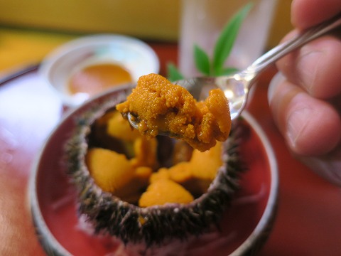 20:36 殻付きウニ 目の前の冷蔵ガラスケースに殻付きのウニがあったので、注文。 東北のウニの旬は夏場です。 秋口にかけて産卵のため身がやせてしまいます。 もう今の時期は、旬が終わっているので、身が入っているのは10個に1個ぐらいだそうです。 で、その1個。 旬が終わっているので、食べられないかと思っていたのに食べられるなんて、ちと嬉しい。 |