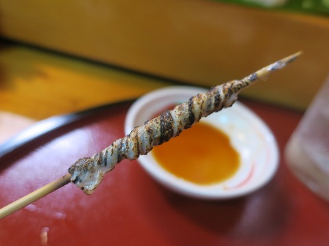20:37 竹串に巻く ほぃと渡された、竹串。 と、思ったら何か巻いてありました。 さっき食べた刺身のサヨリの皮を巻いて炙ったものだそう。 甘みがあって、香ばしさもあって、美味しい。 美味しい食べ方、色々あるんですね。 もっと食べたいけど、皮はあくまでも刺身の副産物です。 お一人様、1本まで。 |