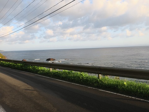 5:47 海岸線を むつ市のローソンで休憩した後、一旦国道279号線を北上。 その後、海沿いに出たら大間を目指して海岸線に沿って北西にバイクを走らせます。 天気が良くなってきました。 けど、気温が上がるにはもう少し時間がかかりそうです。 |