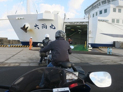 6:27 乗船開始 乗船の予定時刻は出船の30分前の6時半から。 予定時刻より前に、みんなそろったので乗船を始めます。 まずは、船室の端っこに駐めるバイクから乗船開始です。 |
