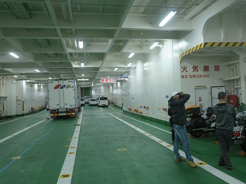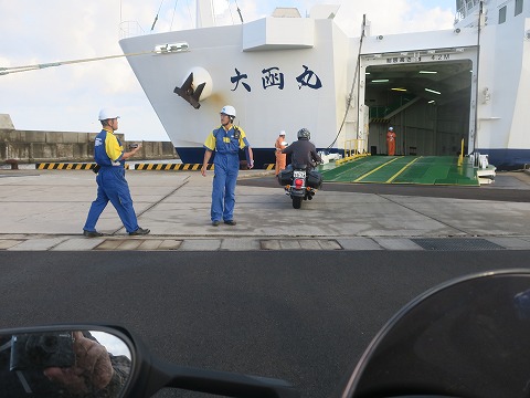 6:28 乗船開始 乗船の予定時刻は出船の30分前の6時半から。 予定時刻より前に、みんなそろったので乗船を始めます。 まずは、車両甲板の端っこに駐めるバイクから乗船開始です。 |