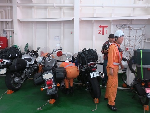 6:30 バイクを停める フェリーに乗船したら、甲板員がバイクを固定します。 バイクは全部で5台だったかな。 バイクを停めたら、最低限の荷物を持って客室甲板に上がりましょう。 |
