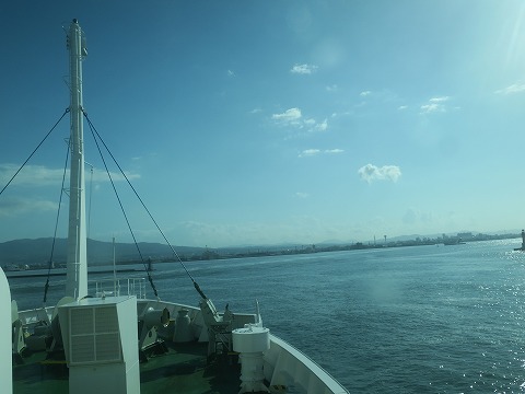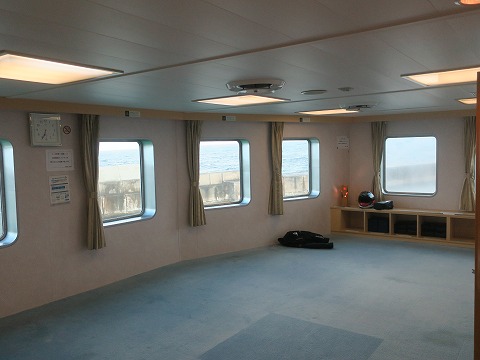 6:34 客室は 客室に到着。 客室は何種類かあって、リクライニング・シートの高級仕様と、この部屋の様に雑魚寝のスタンダード。 乗船している時間が1時間半と長くはないので、長距離フェリーの様なベットルームはありません。 もちろん自分はスタンダードで、雑魚寝です。 で、クルマの乗船が始まったばかりで、1番乗り。 角っこの一番景色が見渡せる場所を占領します。(笑)。 |
