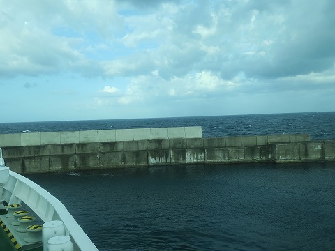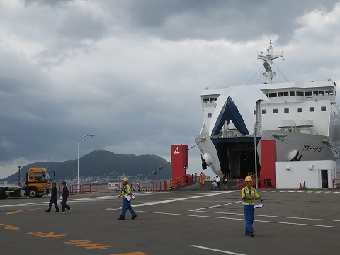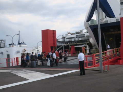 8:40 下船 下船が始まりました。 まずは、クルマ(4輪)から。 フェリーの桟橋って、積載量によってフェリーの高さが変わったり、潮位によって水面の高さが変わるので、フェリーと陸側がなるべく水平になるように桟橋の高さを調整してるんですね。 で、フェリー側は兎も角、陸側は油圧で高さを調整しているみたいなんだけ、油圧って電気でモータ回して発生させているので、停電しちゃうと、その桟橋の高さを調整出来なくなるわけで。 そのため、桟橋が急角度になった状態だと、車高の低い乗用車は下部を擦っちゃうので、タイヤの下にロープを敷いたりして、1台1台調整しながら下船させています。 「こりゃ、下船するまでに時間がかかりそうですね。」 |