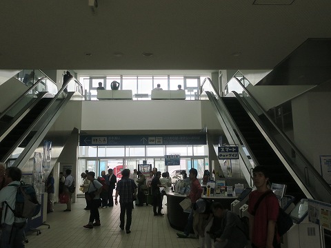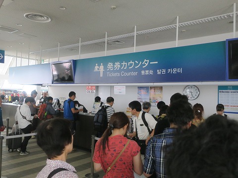 8:59 戻るか。 戻れるか? ターミナル内の売店も、停電のため営業はしていません。 もちろん、飲物を買おうとしても自動販売機も動いてません。 「こりゃ、朝市で朝食どころじゃありませんね。」 とりあえず、戻れるか。 戻るフェリーに空きがあるのか。 確認するために発券カウンターの列に並ぶことにします。 列は今の時点で30mくらいかな |
