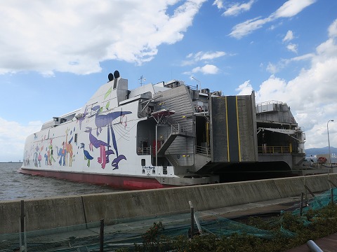 11:06 なっちゃんWorld 停泊中の幅の広い船は”なっちゃんWorld”という名のフェリーです。 このフェリーは左右に2つの船体を接続した形の双胴船で、一般的に使われているスクリューではなく、ウォータージェットで推進力を得ているのが特徴の高速船です。 通常フェリーであれば青森〜函館は3時間40分を有しますが、このなっちゃんWorldであれば、約半分の1時間45分ほどで結ぶことができました。 けど、コストが高かったんですねぇ〜。 wikiによると 2008年5月に定期便として就航して、その年の11月には定期運用を終えてるんです。 その後、2009年〜2012年は夏期の繁盛記だけ運航したようですが、今はチャーター便として使うことはあるようですが、あまり使われておらず、ここ函館港に係留されていることが多いようです。 ただ、この後、船からターミナルに電線を引っ張って、地上に電気を供給して活躍(?)してましたよ。 |