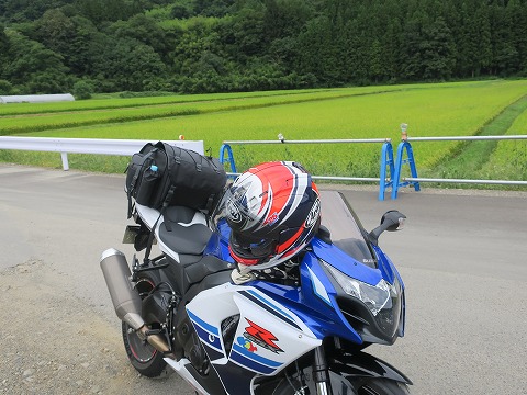 13:03 昼食後 Go EASTツーリング、3日目の昼は岩手県の岩泉町で昼食を食べました。 お腹がこなれたところで、出発します。 ”よってけ市場組合”の脇に広がる田んぼの緑がきれいですね。 |