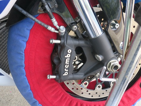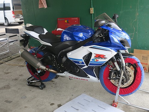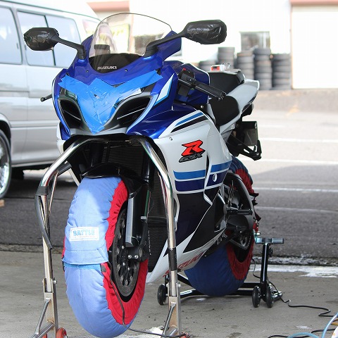 8:32 タイヤウォーマーを巻く? 走行準備をしている間、ウォーマーを巻いてタイヤを暖めておきます。 今、GSX-Rが履いているタイヤは MICHELIN POWER RS です。 POWER RS は サーキット用のタイヤではなく、街乗りメインのハイグリップタイヤです。 ので、温度依存性は低いので、タイヤウォーマーを巻かなくても、タイヤはそこそこグリップするんですけどね。 まあ、せっかく持っているので、気分で暖めておきます。(笑) (暖めておいた方が、走り初めのグリップが良いことは確かです。) |