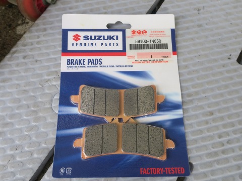 9:10 純正で 交換したパッドはSUZUKIの純正品。 CBRの修理が間に合いそうにないのがわかった時点でメタリカ製のパッドを注文しておいたんですが、納期が間に合わず、急遽純正を注文。 で、間に合いました。 (^_^;) 流石メーカー。(笑) |