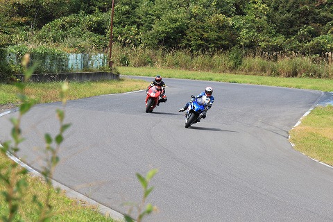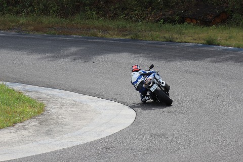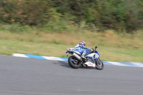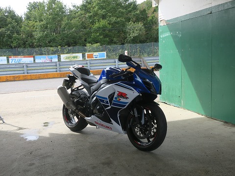 9:56 走行開始 つなぎに着替えたら、コースイン! 走行中の写真はアイスエイジさんに写してもらいました。(感謝!) 5月の末以来の4ヶ月ぶり&GSX-Rのサーキット・デビュー走行と言うこともあって、まずは恐る恐るのスタートです。(笑) |