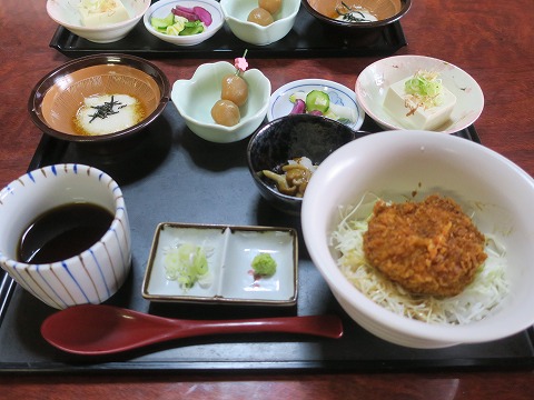 12:39 ソースカツ丼・板そばセット しばらく待って、”ソースカツ丼・板そばセットのソースカツ丼が運ばれてきました。 色々と小鉢がついて嬉しいですね。 それでは、「いただきます。」 玉コンニャクは自家製とのこと。 コンニャク特有のむにゅとした食感が口に楽しいです。 とろろ と丼の裏に隠れているナメコおろしは、蕎麦と一緒に食べることにしましょう。 ソースカツ丼も美味しいですね。 ご飯の上に載ったキャベツの千切りが少し蒸されて、クニャッとなったのも美味しいです。 |
