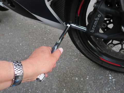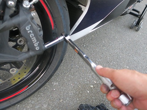 右側のパッドの交換が終わったら、キャリパーを規定トルクで締め付けて。
