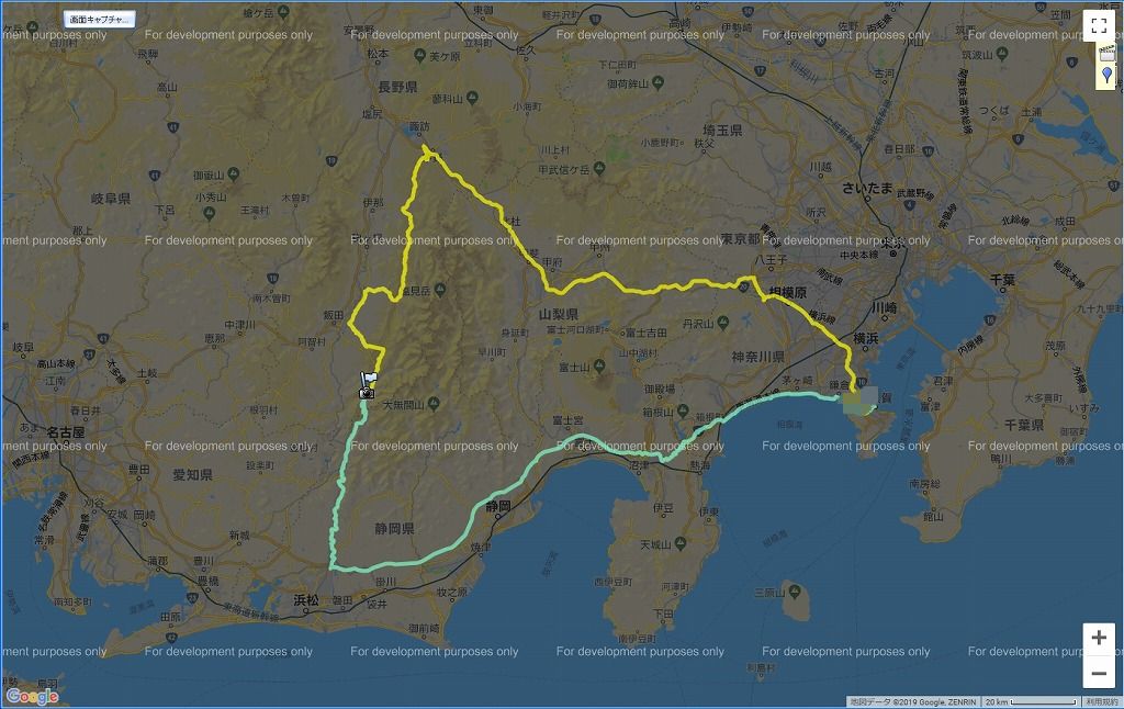 | 復路(黄色)の道程:道の駅遠山郷~喬木村~諏訪インター(中央道)~相模原インター~自宅: 327.2 km | |