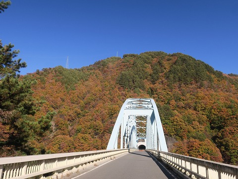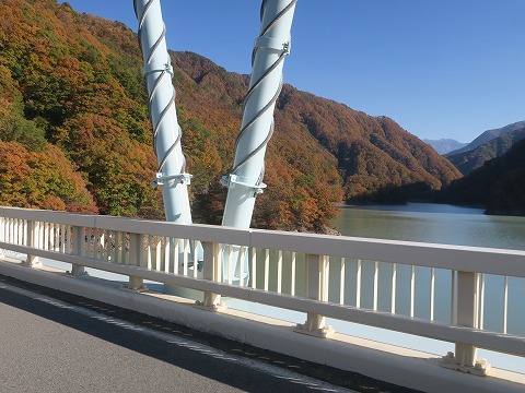 14:08 四徳大橋(しとく おおはし) 県道59号線を東進すると、小渋(こしぶ)ダムによってせき止められて作られた小渋湖が右手に現れます。 小渋湖に架かる四徳大橋を渡ります。 この辺りはちょうど紅葉の真っ盛り。 赤系は少ないですが、黄色に色づいた木々がきれいです。 今の時期、関東周辺で紅葉している場所に行くと、クルマが渋滞していて辟易(へきえき)とします。 そのため、今回はあえて紅葉の名所を避けたルートで走ったのですが、この辺りはガラガラでしかも紅葉も楽しめてラッキーでした。 (^_^)v |