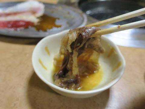 17:50 生タマゴを すき焼きと同じように、生タマゴを付けて食べます。 生タマゴは卵黄だけでした。 かなり甘めの味付けですけど、美味しい。 味はすき焼きに似ていますが、割り下の汁が無い分、もっと濃厚です。 これもたくさんの量は食べられ(入り)ませんね。 ちょっと味の変化を楽しみたいときに頼むのがよろしいかと。 |