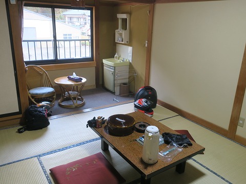 16:12 部屋は 先にMAOH さんが到着していたので、後から到着した自分は受付で面倒な手続きとか無しで部屋に直行です。 部屋は2階で、8畳+α。 お二人様ですので、十分な広さです。 トイレは共同、風呂は100%源泉掛け流しの男女別々の内湯と貸し切りの露天風呂が1箇所あります。 民宿だからと言うわけはありませんが、壁は薄め。(笑) 夜中に騒いだら隣の部屋から怒られること間違いなし。 たぶん。 |