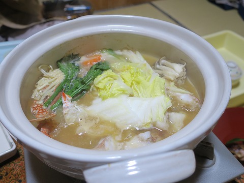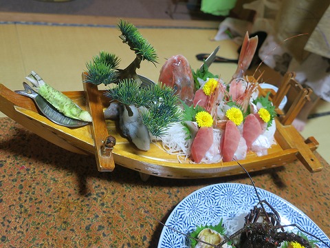 17:47 夕食 夕食前に、ツーリングで冷えた体を温泉で温め。 汗をかくほど十分に体が温まったところで、ビールで喉を湿らせていると夕食の時間になりました。 夕食は6時から、部屋食です。 ちょっと早めに料理が運ばれてきました。 まずは、舟盛り。 ホウボウの活き作りにマグロ、エビ、イカなどの盛り合わせ。 ホウボウ美味しいです。 (*^o^*) |