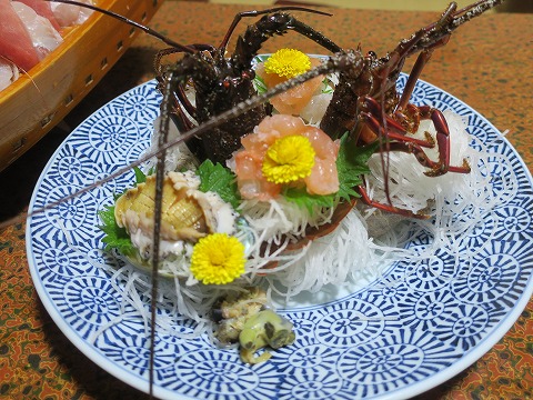 17:47 伊勢エビ 続いて伊勢エビの活き作り。 可哀想だけど、まだ触覚が動いてるんだよねぇ~。 (でも、痛点はないらしい) 「おいしい!」 (*^▽^*) 小っちゃめのアワビも付いてます。 アワビの刺身はコリッコリ。 肝が旨いですね。 「う~ん、贅沢。」 |