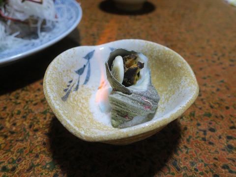 17:48 サザエ壺焼き そして、小さめですがサザエの壺焼きも。 下に敷いた塩にアルコールを浸して、火を付けてあります。 熱々でいただけます。 |