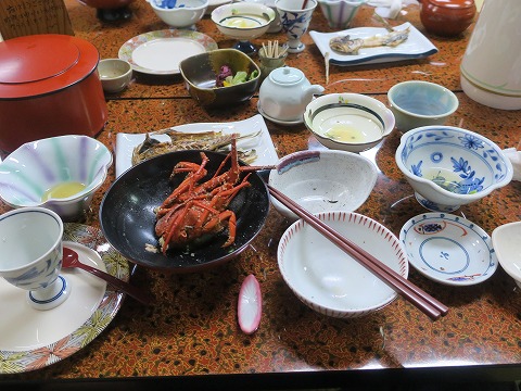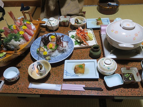 17:50 全景 料理の全景。(笑) 十分過ぎるほどの量があります。 カニなんかもあって、贅沢。 若い頃だったら、次に食べる食事のことなんて気にしないで食べられたのに、夕食の腹具合を気にかけながら昼ごはんを食べなければならない歳になっちゃいましたね。 ( ̄。 ̄;) でも、原則 |