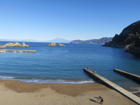 雲見を去る前に、まずは雲見大橋の上から雲見の象徴とも言える奇岩の牛着岩(うしつきいわ)と富士山をバックに写真を1枚。