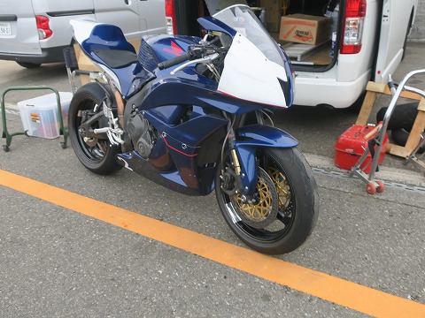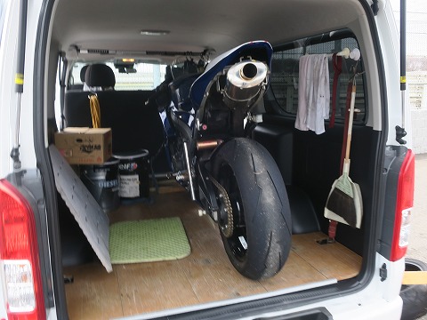 6:56 そのままで載る 今までのCBRはハイエースの荷室よりもちょっと長くて、リヤホイルを前にずらさないと積めなかったんですけど、このPC40はちょっと短いみたいで、リヤホイルを前にずらさないでもそのまま載せられました。(とっても楽!) で、さっそくハイエースから下ろして走行の準備を始めます。 前のCBRは赤だったけど、今度のは”紺色”ですね。 ゼッケンも貼らないとね。 |