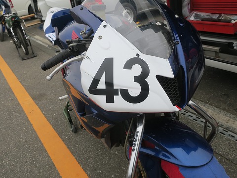 8:05 ゼッケンを貼る ゼッケンが貼ってなかったので、ゼッケンを貼り付け。 番号はCBR600RRで一番最初に貼った”43”。 最初のCBR600でレースにエントリーしたときの年齢が43歳だったので、43にしたんです。(笑) もう12年前の話になっちゃいました。(^_^;) ゼッケンだけでも初心に戻ります。 年齢は戻りませんけどねぇ〜。(爆) |
