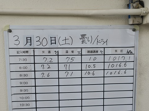 8:46 寒いよ コースインゲート脇にあるコンディション ボード。 寒いね。 路面温度も10℃ちょっとと低め。 1本目の走行までにもう少し上がるかな。 |