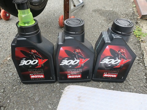 14:19 オイルを オイルを準備。 使いかけ+2本。 フィルターを交換しないので、2.5リットルくらいでたりるかな。 オイルは MOTUL の300V。 箱売りも2ダース目に突入しました。(汗) |
