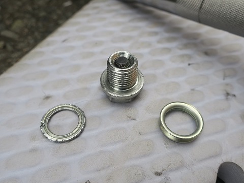 14:36 ワッシャは ワッシャーは新品に交換。 安いものなので、ケチってオイルが漏れることを考えると交換しておくのが得策。 で、この使ったワッシャーが外しにくい。 ガッチリとドレンボルトに食い込んじゃっていてね。 無理して取るので、ドレンボルトにキズが・・・・。 その内、このキズからオイルが漏れそうです。(汗) |