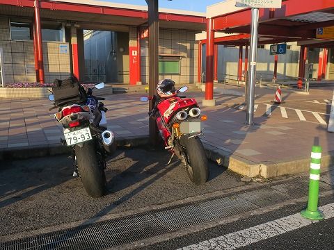 5:39 上里サービスエリア 外環道を西走して大泉JCTまで進み、その後関越道へ。 関越道を北上するころには朝日が昇ってきたので、暖かくなるのを期待。 したけど、ダメだった。 (-_-;) 北上するに従い、気温が下がり始めて バイクのカウルに貼り付けてある moto Fizz の温度計は 10℃ を示します。 「寒いじゃないの。」 「ああ、早く太陽が高く昇って、暖かくなって〜。」 天気予報では25℃くらいまで上がるって言ってたじゃない。(笑) なんて、思っている内に、約束の20分前に上里サービスエリアに到着。 早いね。 DUCA の岩井さんは到着済です。 |
