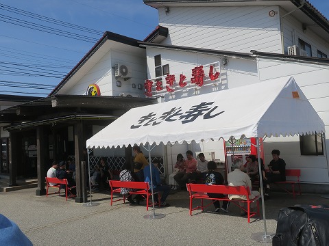 13:37 お昼はきときと寿し 宇奈月温泉ツーリング1日目のお昼は、ちょっと遅くなりましたが、きときと寿しの黒部店までやってきました。 きときと寿し黒部店は過去2回ほど訪れているお気に入り回転寿司ですが、こんなに混んでいるのは初めて。 店の前には、ウェイティング用のテントが張られています。 テントが張られているのは、ゴールデンウィーク対応の様です。 お昼のピークの時間は過ぎていますが、まだウェイティング中。 順番が呼ばれるまで待つことにします。 |