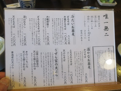 12:05 注文は お品書き。 うどんはまったく無いんだね。 潔し。 お品書きはいたってシンプル。 そばに、山芋(とろろ)か大根(おろし)か天ぷらを添えるかだけだ。 天ぷらの主食にそばと言うのはベストな組み合わせだとおもってます。 天丼ならまだいいけど、白ごはんに天ぷらって、なんとなくダブル炭水化物っぽくってね。 天ぷらがイマイチ白米のおかずにならないような気がします。 天ぷら屋さんに行って、白ごはんを食べながら、板さんに天ぷら差し出されて、「まずは塩で食べてみて下さい。」とか、言われても困っちゃうだろうなぁ〜。(笑) で、これだけ天ぷらに話題を振っておきながら、注文は”ざるそば”。 デフォルトで大盛でございます。 |
