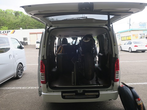 16:39 片付け 走行後、ツナギを脱いだり、ガソリンの残量を図ったり、ダラダラと片付けてようやくバイクがハイエースに載りました。 そして、ハイエースの脇には、おニューのタイヤ。 帰ったら、付け替えますよ。 この新しい('10年式)のCBR(PC40)は今日乗ってみた感じ、去年まで乗っていた '05(PC37)よりもコンパクトに旋回できるみたいです。 今までのバイクのつもりでコーナリングすると、クリッピング ポイントより前にインに付いちゃう感じ。 なので、もっと速くコーナーリングに入って、クルッと回ったら、もっと早くアクセルを開けても旋回できると言うことなので、それを生かせるライディングをするようにしていかないとね。 そうすれば、まだタイムが縮められる可能性があるかも。 |