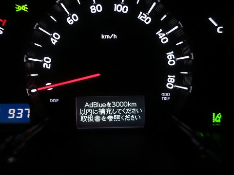 21:37 AdBlue 警告 このハイエース、排ガスの窒素酸化物を低減させる尿素SCRシステムが搭載されています。 この尿素SCRシステムに必要なのが、高品位尿素水の AdBlue(商品名)。 ハイエースは容量が7.5リットルの AdBlue のタンクが載っているらしい。 で、AdBlue は大体走行 1,000km で 1リットル消費するとのこと。 その話だと、AdBlueがもう無くなっちゃうんじゃないかとおもって気になっていたんですが、ようやく警告が出ました。 でも、あと 3,000 km 以内って表示が出ましたので、一安心。 この分だと、満タンで10,000km毎の補充で大丈夫そうです。 (おわり) |