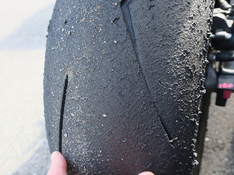 ほぼ終了 走行後のリヤタイヤ。 ちょっと寝かしながらアクセル開けていくところの一番減るところの溝が無くなっちゃいました。 ほぼ終了ですね。 ここまで使ったの久しぶり。(笑) 帰ったら交換だな。 それでは、片付けることにしましょう。 |