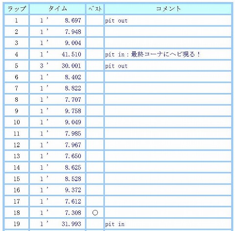 14:33 〜 14:58 午後の走行 1本目 (O_O) 「はっ!」と目が覚めたら、小一時間寝ちゃって、既に2時過ぎ。 (゚o゚;) 今日の走行時間は4時までなので、のんびりしている時間がなくなってきました。 ちゃっちゃと準備をして、午後1本目の走行を開始します。 模擬レースでベストに近い4秒台が出たので、いい気になってペースを上げすぎてやらかしちゃわないように。 タイヤも減ってきたので、午後の走行は無理にペースを上げずに、バイクを理解するように走ることにします。 周回を初めて3周目、最終コーナーの立ち上がりにチェーンが! (゚Д゚) 落ちてる。 こんなところでチェーンが切れて、バイクはどこに? と思いつつも落ちているのはラインの内側なので、まあ危険は無いと思いますが・・・。 でも、他に誰も走ってないので、スタッフにお知らせして回収してもらおうかと一旦ピットイン。 1周回ってきてちゃんとした場所を確認しようと見たら、「ない?」 と思ったら、ピットレーンの入口に移動? しかもクネクネ。 『うわぁ! ヘビじゃん。』 (O_O) 落ちているのがチェーンかと思ったら、ヘビでしたぁ〜。 しかも2mくらい。 ヘビ嫌いです。 (+_+) 一旦ピットに戻って、気持ちを落ち着けて再度、コースイン。 ヘビが居なくなったのを確認。 ヘビ踏んじゃうと滑りますからね。(ーー;) そのまま、色々と走りを確認しながら周回。 18周目に今回のベスト、平凡だけど、遅いけど7秒3。 19周回して、ピットに入ります。 |
